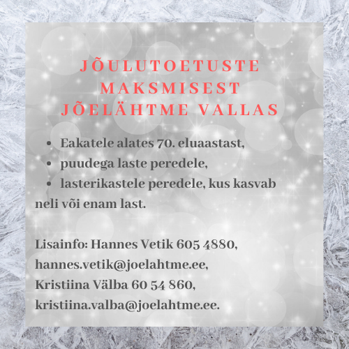 Jõelähtme vallas makstakse jõulutoetust eakatele alates 70. eluaastast, puudega laste peredele ning lasterikastele peredele, kus kasvab neli või enam last. Toetuse suurus on 100 eurot inimese kohta ning toetuse saaja elukoht peab olema rahvastikuregistri järgi Jõelähtme vallas hiljemalt käesoleva aasta 1. jaanuari seisuga.