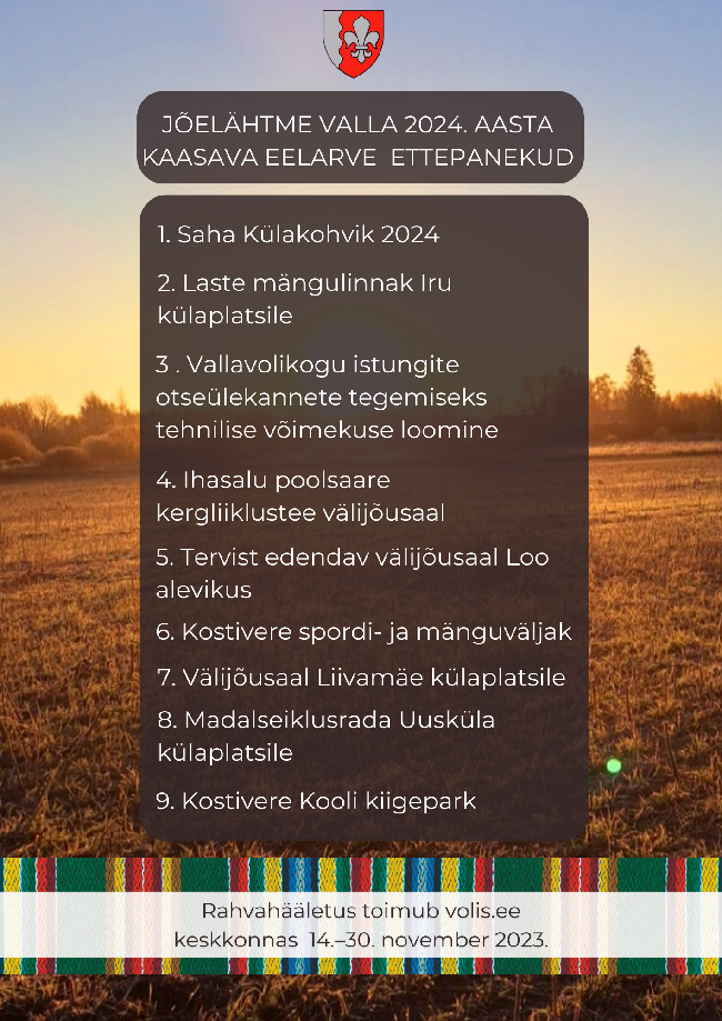 Jõelähtme valla 2024. aasta kaasava eelarve rahvahääletus Jõelähtme vallavalitsus kutsus valla arengust huvitatud inimesi tegema ettepanekuid valla kaasavasse eelarvesse. Ettepanekud on...