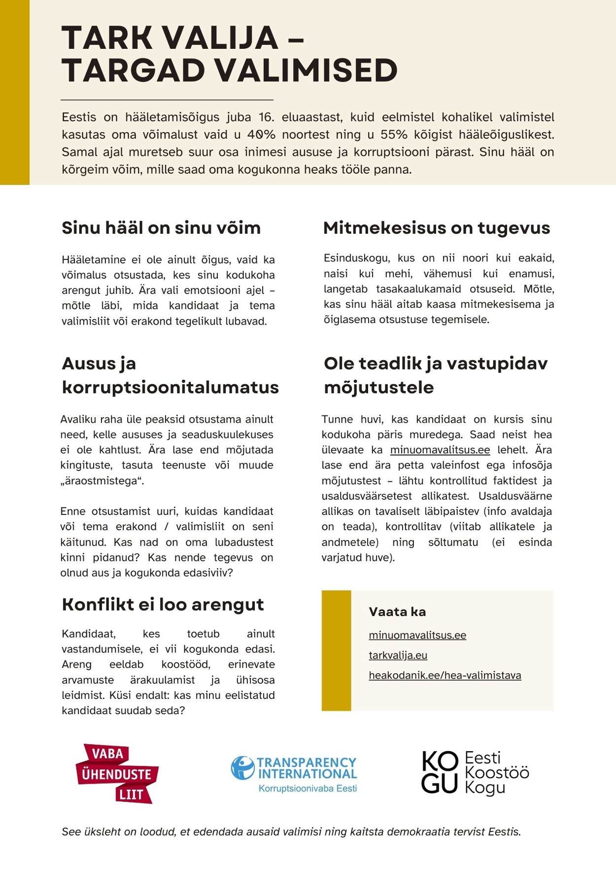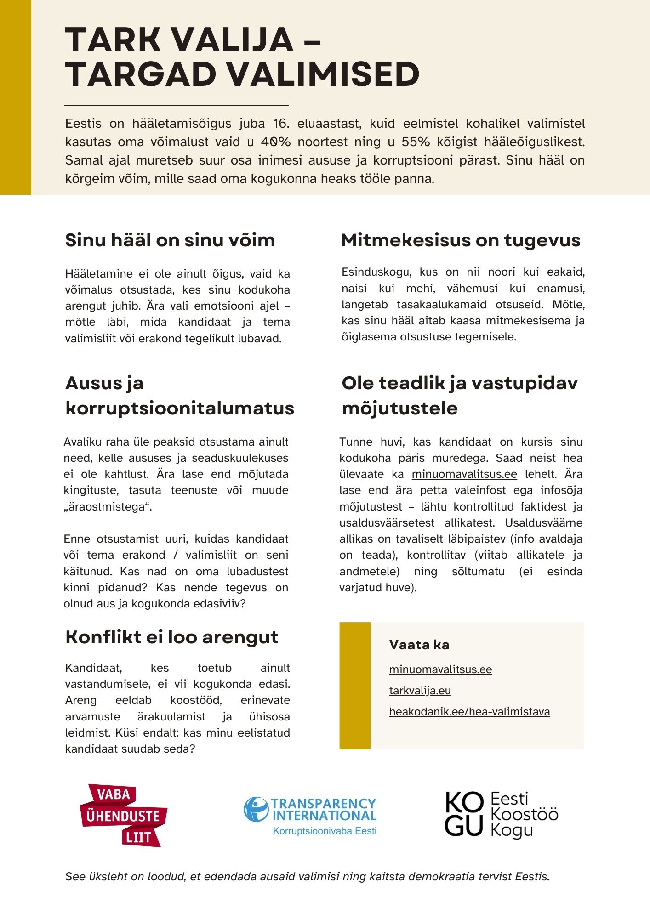 Vabaühenduste LiitKorruptsioonivaba Eesti ja Eesti Koostöö Kogu on koostanud targa valija meelespea, mis aitab läbi mõelda, kuidas oma hääl oma kogukonna jaoks kõige paremini tööle panna.