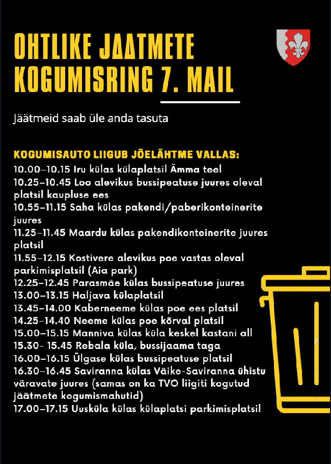 16.30–16.45 Saviranna külas Väike-Saviranna ühistu väravate juures (samas on ka TVO liigiti kogutud jäätmete kogumismahutid)