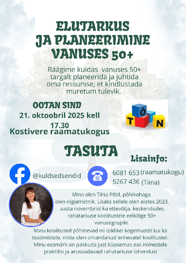 T, 21. oktoober 17:30 Täiskasvanu Õppija Nädal – rahatarkuse koolitus Kostivere raamatukogus https://kalender.joelahtme.ee/kalender/ton-elutarkus-ja-planeerimine-vanuses-50/ T, 21....