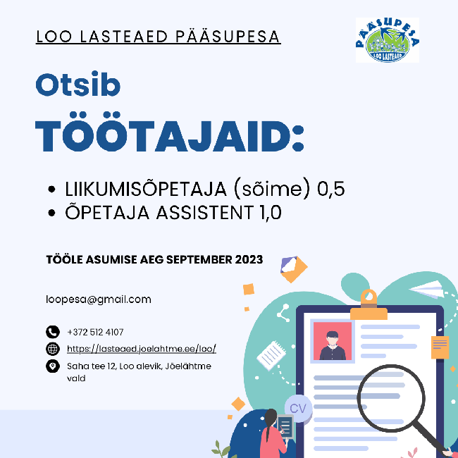 Loo lasteaed Pääsupesa pakub tööd liikumisõpetajale ja õpetaja assistendile