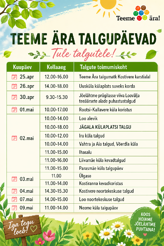 Üle-eestiline talgupäev toimub traditsiooniliselt maikuu esimesel laupäeval. Talgute eesmärk on parandada elukeskkonda, korrastada objekte ja edendada ühtekuuluvustunnet. On rõõm, et ka...