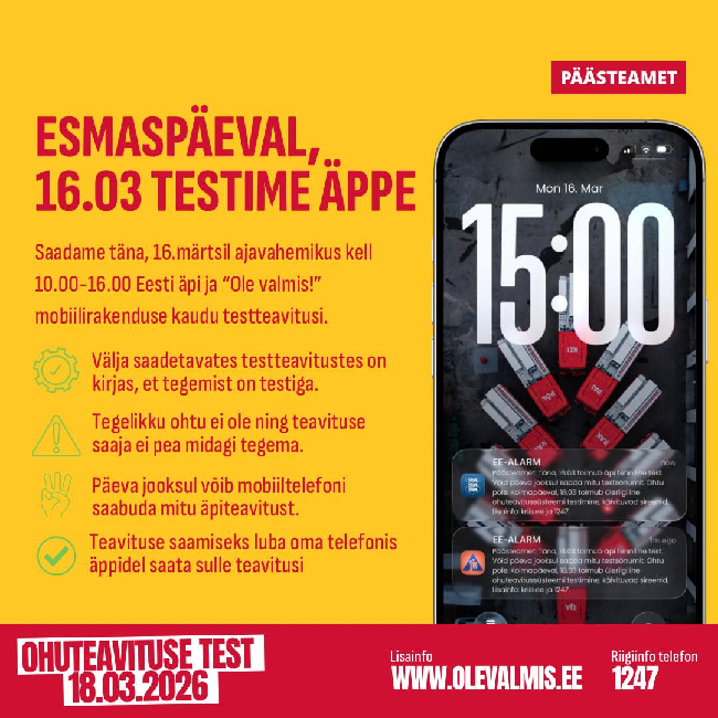 16. märtsil testitakse mobiilrakenduste kaudu ohutavituste saatmist