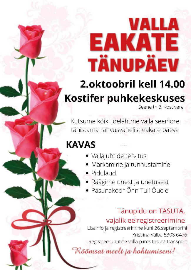 2. oktoobril kell 14 toimub Kostiveres Kostifer puhkekesukes tänupäev Jõelähtme valla seenioritele. Programm on tasuta - oma osalemisest palume teada anda hiljemalt 26. septembriks kristiina.valba@joelahtme.ee