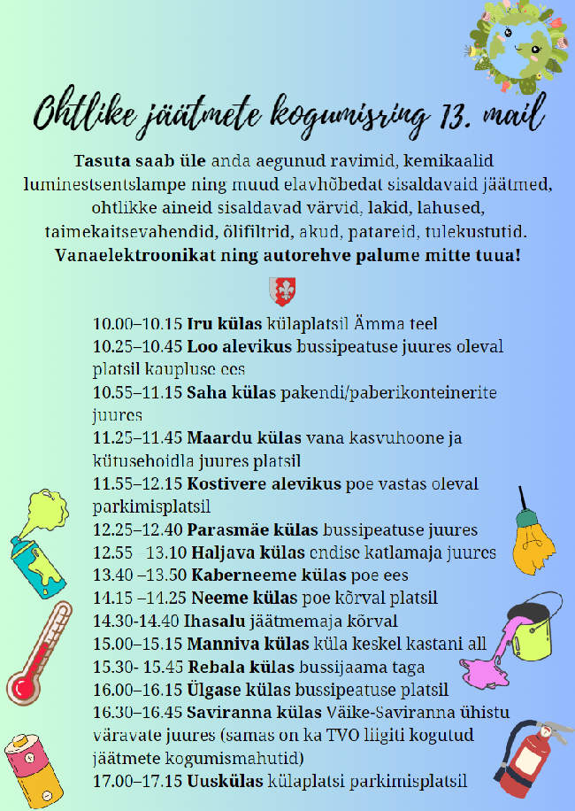 16.30–16.45 Saviranna külas Väike-Saviranna ühistu väravate juures (samas on ka TVO liigiti kogutud jäätmete kogumismahutid)