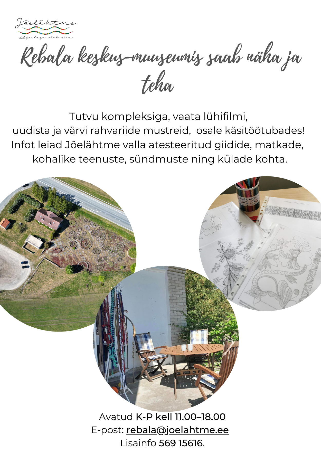 Rebala keskus-muuseumis toimuvad lisaks juhendatud käsitöö töötoad. Saab kõike ise järele proovida, nõu küsida ja valmistoote ka koju kaasa! Töötubade kestuseks on kuni kaks tundi. Hind täiskasvanule 15 ja lastele 10 eurot. Juhendatud käsitöötoad toimuvad neljapäeviti. Juunikuised töötoad võtavad aset 22. ja 29. juunil kell 16. Teistel päevadel, kellaaegadel kokkuleppel või kui juhendaja on kohal, siis jooksvalt vastavalt soovile.