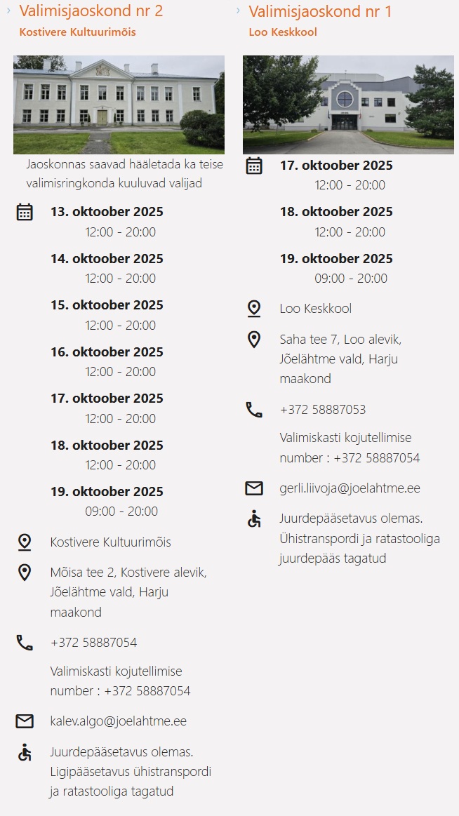 ✅Valimisjaoskond nr 2 Kostivere kultuurimõisas Mõisa tee 2, Kostivere alevikus. Hääletada saab 13.–18. oktoober kell 12.00–20.00 ja 19. oktoober 09.00–20.00.