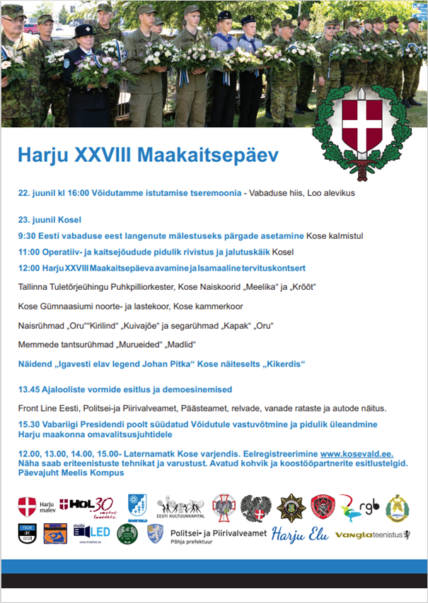 🔥 Harju XXVIII Maakaitsepäev toimub sel aastal 23. juunil Kosel, kus Eesti Vabariigi Presidendi poolt süüdatud Võidutuli vastu võetakse ja kohalike omavalitsuste juhtidele üle antakse.